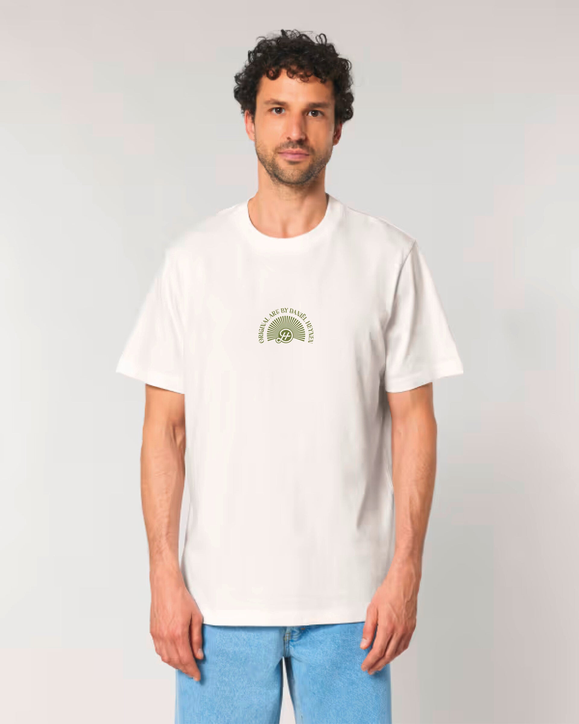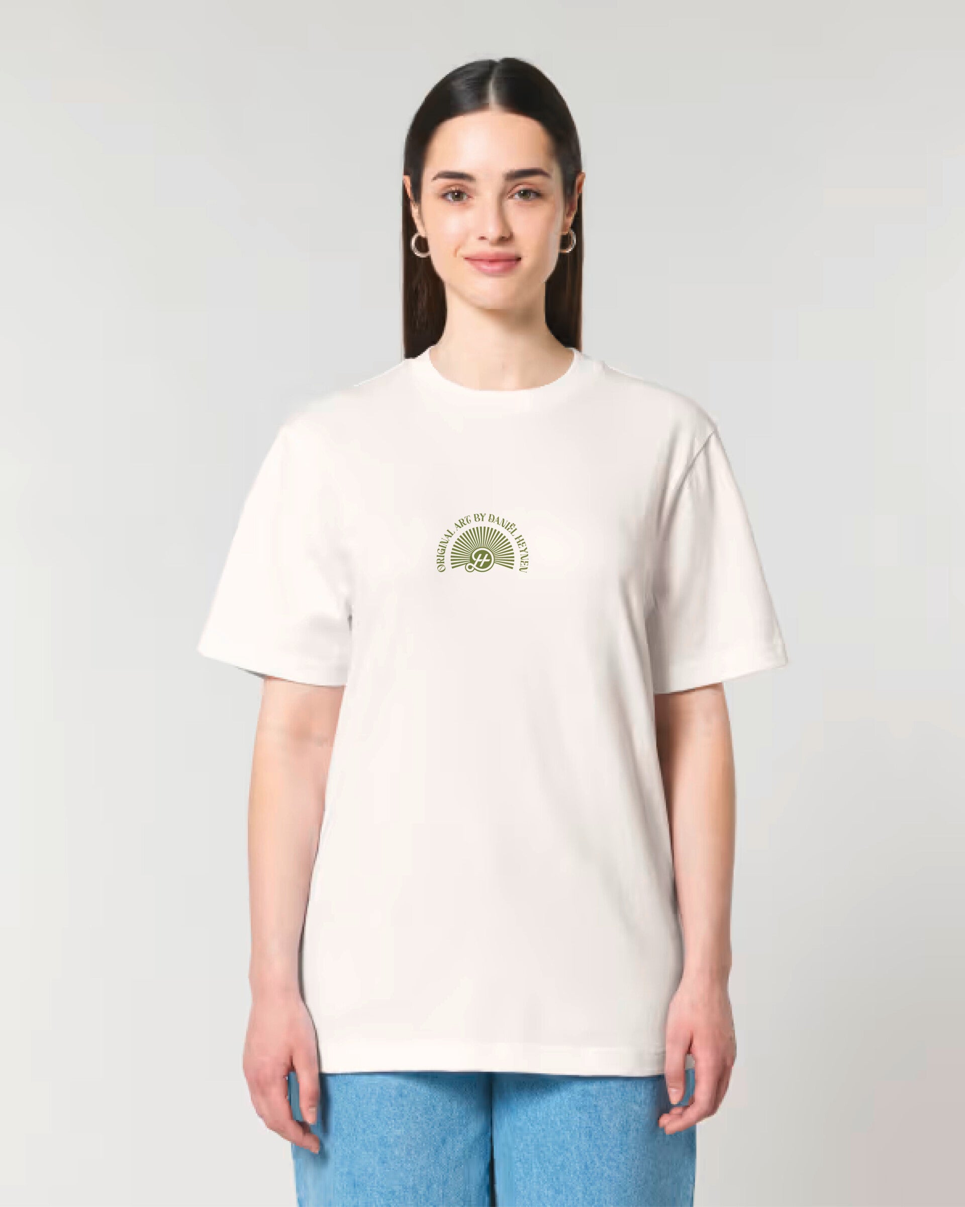 Voor- en achterzijde met zeefdruk techniek bedrukt in Groen & Zalmroze. De kleur van het unisex shirt is Off White, heeft een comfortabele pasvorm en is uit 100% katoen. Het shirt is van een zware kwaliteit 215 g/m2 vervaardigd. Verkrijgbaar in de maten L & XL